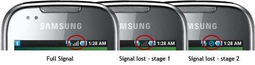 When the phone loses the signal, the bars indicating the signal suddenly grey out in most cases and are replaced by a blue circle with a diagonal bar in it some cases. In the About phone menu, the loss of the signal can also be seen in the about phone menu in the signal readings which go all the way down to 0.